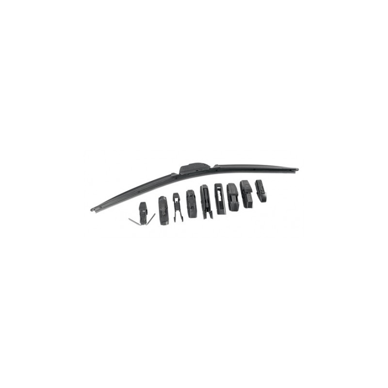 Sistema di montaggio multiplo, fino a 11 raccordi in dotazione a seconda della misura:. 1 raccordo per il montaggio su tutte le vetture equipaggiate con tergicristalli tradizionali.. 10 raccordi speciali A+B+C+D+F+G+H+J+L+M per il montaggio su tutte le vetture all.origine con spazzole senza articolazioni.. Design avanzato ed aerodinamico.. Struttura in acciaio con rivestimento in gomma.. Perfetta aderenza per una pulizia efficace. Lamina in gomma speciale con trattamento in grafite per minimizzare l.attrito a contatto con il cristallo