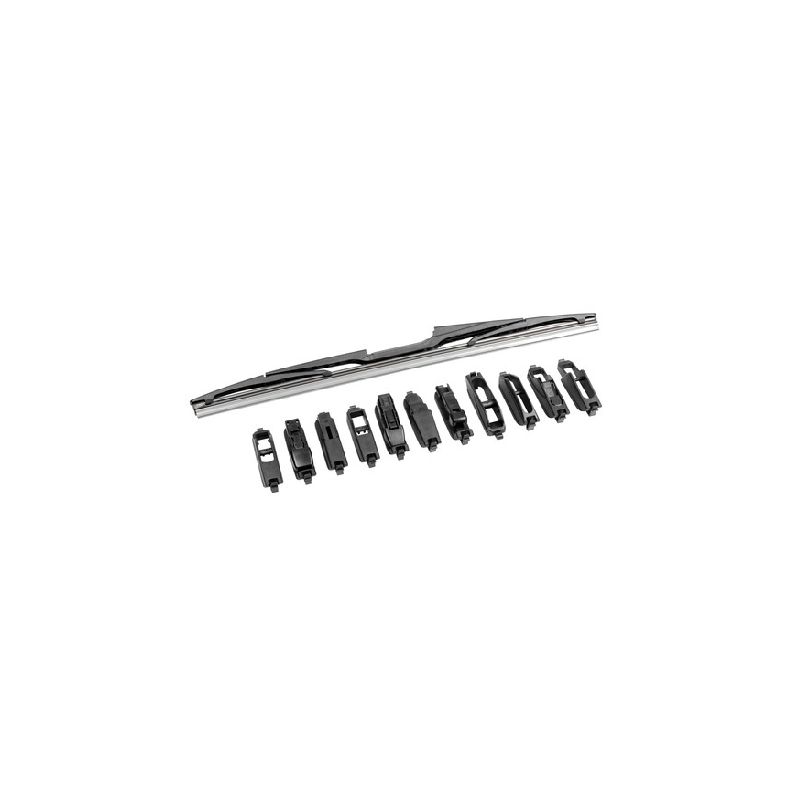 Sistema di montaggio multiplo con 11 raccordi in dotazione.. Universale, per la quasi totalit. delle vetture in circolazione.. Perfetta aderenza per una pulizia efficace.. Lamina in gomma speciale con trattamento in grafite per minimizzare l.attrito a contatto con il cristallo